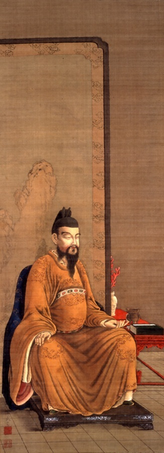 三幅のうち中幅には蝗を手にした唐朝の第二代皇帝太宗を描く。太宗は、山水図衝立を背障として濃い青色の雲文金襴をかけた椅子に坐した姿で表されている。衝立の傍らには文房具を置いた卓が配される。太宗は左手の掌に蝗をのせ、正面よりやや左を向いて前方を見据えている。本図は飢饉をもたらした蝗の害を民に代わって自らが負うため、臣下の制止にもかかわらず蝗を飲み込んだという『貞観政要』の故事に基づく鑑戒的主題の作品であり、秋田藩士である直武が漢画の伝統的ジャンルを西洋画法で表現しようとしたものである。