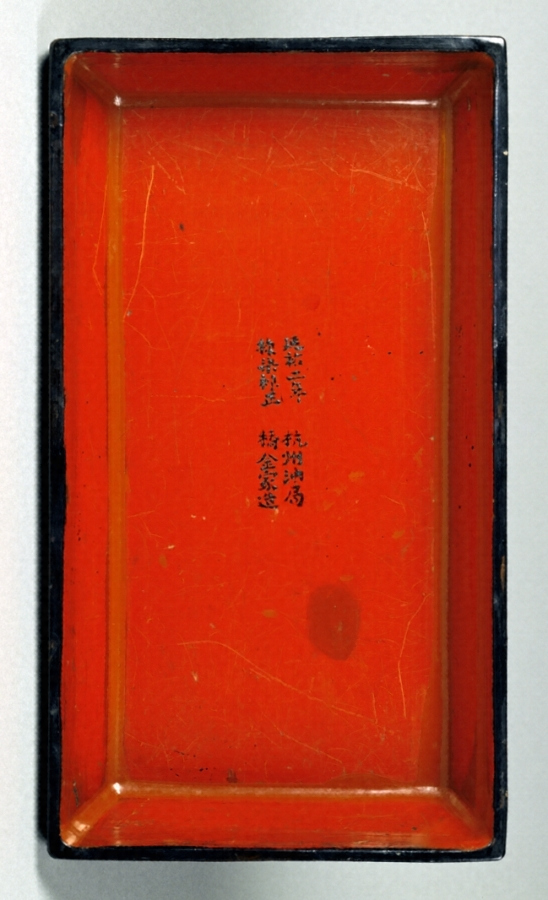 わが国に伝世した元代鎗金経箱の作例は、本品を含め現在一〇件ほど(うち八件が重要文化財)が知られ、うち六件には銘文が記される。そのうち福岡・誓願寺蔵の重文・孔雀文沈金経箱と広島・光明坊所蔵の重文・孔雀創金経箱には本経箱と同じく「延祐二年/棟梁禅正/杭州油局/橋金家造」という黒漆銘がある。また、広島・浄土寺所蔵の重文・孔雀創金経箱には「延祐二年/明慶寺前/棟梁禅正/宋家造」の黒漆銘がある。さらに、福井・西福寺蔵の重文・孔雀鎗金経箱と京都・妙蓮寺蔵の重文・沈金箱には「明慶寺前/宋家造」の黒漆銘がある。