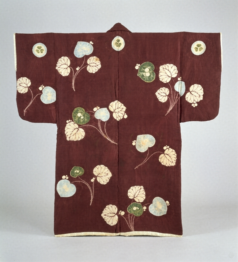 本羽織のような大柄の葵葉を散らした類品には、桃山時代末期に徳川家康(一五四二~一六一六)より新井源左衛門威忠が拝領したとされる「水浅葱練緯地蔦模様三葉葵紋付辻が花染胴服」(東京国立博物館蔵)が知られ、葵の配置、露の置き方、縫い締め絞りの技法、配色の共通性などに類似点が認められる。