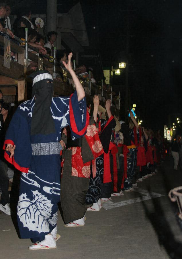 踊り手のうち、とくに女たちは端縫【はぬい】と呼ばれる端布【はぎれ】を縫い合わせた風雅な着物、あるいは浴衣に白足袋のいでたちで踊り、編み笠または彦三頭巾と呼ばれる黒頭巾をすっぼり冠り、顔を見せないようにしている。彦三頭巾のいでたちは亡者をかたどったという言い伝えを残し、盆に精霊とともに踊るという供養踊の伝承の面影をいまに伝えている。