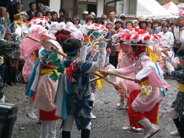 平鍬踊は、福島県南部から栃木県北部に分布しているもので、傘鉾(花枝)を中心に踊り手が輪を作り、木製の鍬を持って踊る。田植踊は鍬頭の久六が旦那の仕事を踊り子たちに言いつけることから始まり、田うないから米つきに至るまで四季の稲作作業を十二種類に分けて踊る。
