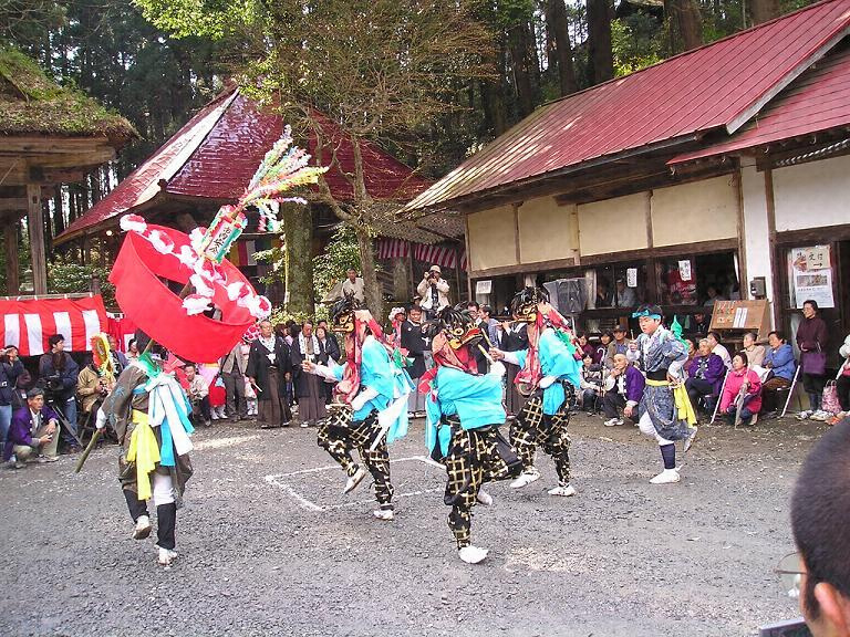 獅子舞は、一人立ち三匹獅子で、傘鉾も加わって舞う。これら三者を組み合わせて伝承している点に地方的特色がある。