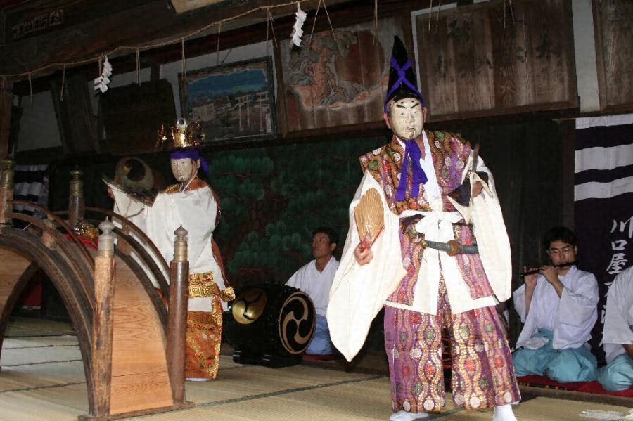北葛飾郡鷲宮町の鷲宮神社の四月十日、十月十日ほかの祭礼に演じられるもので、「土師【はじ】一流催馬楽神楽」ともいわれる。もとは三十六座あったと伝えられるが、享保年中に十二座ほか一座のかたちに整理されたともいわれ、演目には、「神詠」「榊」「国堅」「猿田彦」など十二座と番外「天狐」がある。大太鼓、小太鼓、笛、大拍子の囃子にのって、舞人が神楽歌や催馬楽を詠唱しながら舞う採物神楽の一つである。いずれの舞も、出の舞、神楽歌、舞掛、引込みの舞の四段からなっている。江戸一円に広く分布する神楽の一源流ともなったものである。
