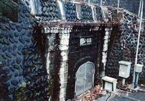 青下第1ダム下流側左岸に設けられた量水池より中原浄水場へ向かう延長696mの導水隧道の上口。隧道坑門は、坑口両脇の柱型やコーニス部のマチコレーション飾りにより仕上げられた丁寧な造りの石造ポータルで、坑口アーチ上部に扁額を掲げる。