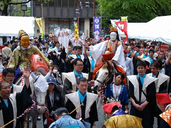 松ばやしは新春を祝う行事で、時の権門勢家を訪れて祝福する芸能で、とくに室町時代は盛んであったことが知られているが、その後はいろいろの変遷があって、ドンタクや港祭の中に取り入れられて今日に至り、博多では、五月三日、四日に行われる、古くより旧博多の流れの町が当っていたが、現在では各組とも参加する町の数が減少している。松ばやしには、福神、大黒、恵比寿と稚児の風流が出る。稚児の風流以外はいずれも仮装の風流で、それらしい仮面をつけ、それらしい仕度が馬上にゆられて市街をまわる。それぞれの風流の言立ては子供が大声で締太鼓の囃子につれて唱える。稚児舞は子供による笛、太鼓、鼓の囃子により舞われる。