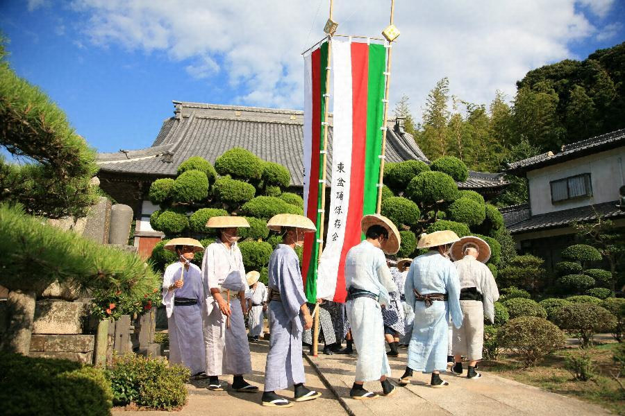 槍、幟、笛、太鼓、踊り手(菅笠、麻製かたびら、日の丸扇を持つ。)の順で神社仏閣等へ行列し、輪にたり哀調の声(神歌、仏歌、色歌)で踊られる。