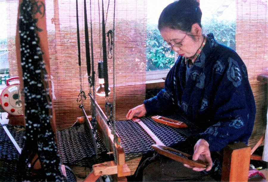 久留米絣は、福岡県の久留米を中心として、三潴【みずま】、山門、三井、浮羽、八女の五郡数か町村にわたる農家の副業として隆盛したが、その後技術の改革は急速に機械化に向かい、手仕事は全く少なくなった。主要な手仕事の技術は、荒苧【あらそ】の手くびりによる絣糸つくり、徳島産の阿波藍【あわあい】による紺屋【こんや】の藍染、投杼【なげひ】による手織等である。