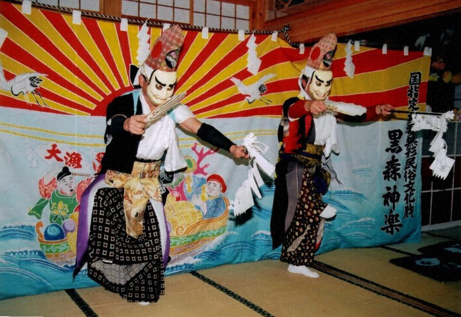 黒森神楽は、権現【ごんげん】様と呼ばれる獅子頭【ししがしら】を持って地域の家々を訪れ、厄払いや家内安全、供養、新築祝いなど様々な願いに応じた演目を演じ、また夜には民家の座敷などで、能や狂言と関わりのある演目などを演じる民俗芸能で、他に類例が少なく、芸能の変遷過程や地域的特色を示している。