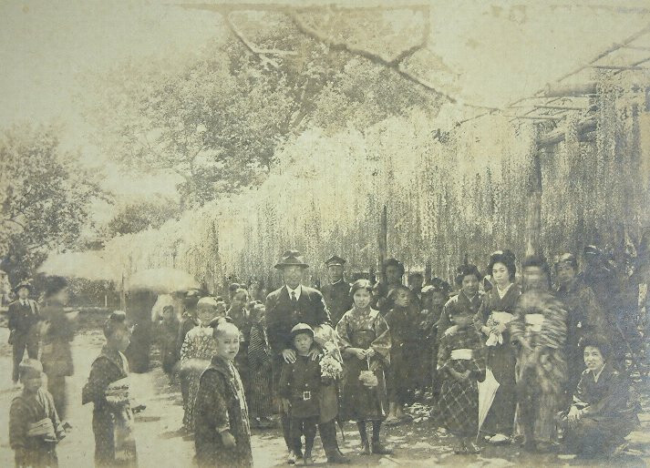 藤 Kraunhia floribunda Taub. var. typica Mak. ノ巨大ナルモノニシテ幹ハ根元ヨリ分岐シ其総周囲三丈餘枝條蔓延花穗九尺ニ逹ス関東隨一ノ巨藤ト称セラル