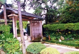 敷地の南東部に位置する。銅板葺の薄いムクリ屋根を載せた数寄屋風の門であるが,内側に広がった小屋根付きの控え板壁を伸ばして高麗門風の構えをとる。鶴の透し彫りが施された板欄間付きの縦格子透し門扉に気品が感じられる。