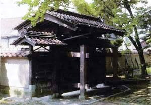 事務所玄関車寄の東南方に位置し,道路からやや退いて建つ。切妻造,越前瓦葺の腕木門で,1間1戸として両開戸を付け,背後に控柱を建てる。左右両脇には半間幅の通用口を設け,越前瓦葺,切妻造の小屋根を架けて織物会社正面の景観を整えている。