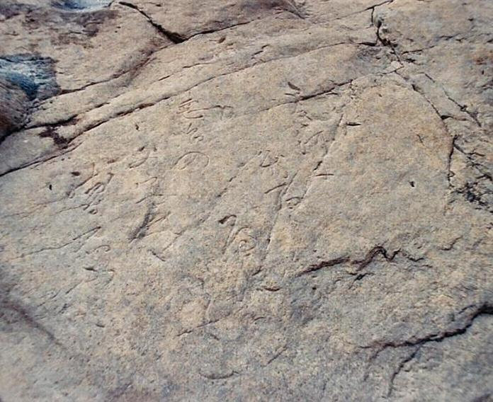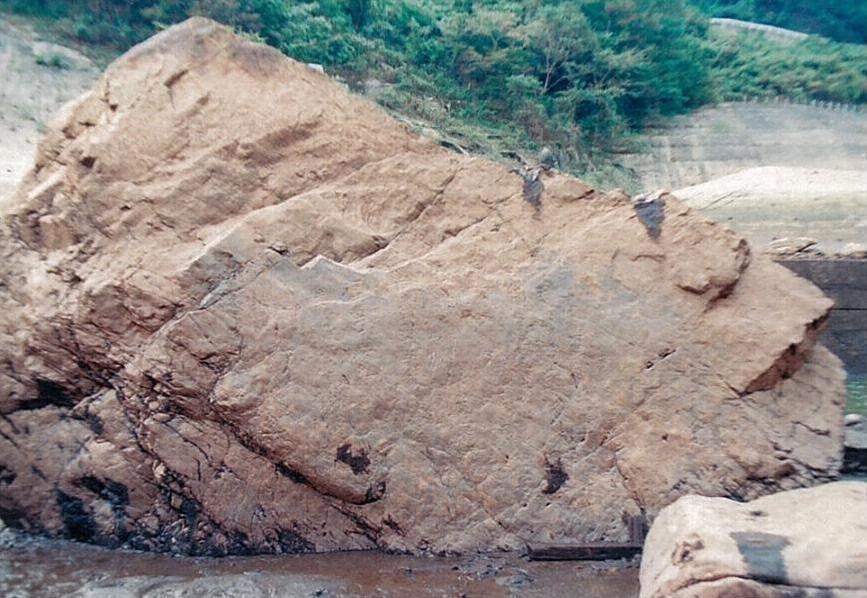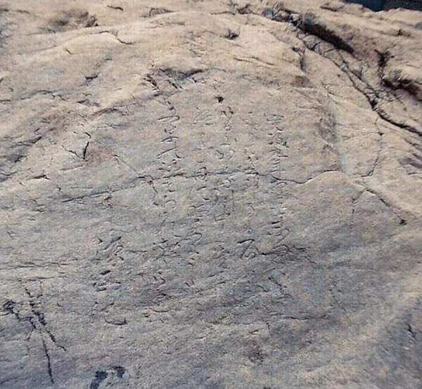 文字岩ハ河底ニ定着セル巨大ナル輝緑凝灰岩ノ北面平滑ナル部分幅約二十尺、高サ約十五尺ニ上下約六尺、左右約七尺ニ亙リ約四廿角ノ文字ヲ十行ニ刻セリ即チ徳治二年