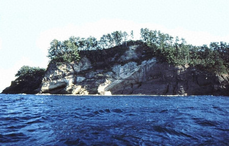 島根半島ノ北端ヲナセル野波村ノ東海岸ニ近ク存在セル一小島ニシテ全島第三紀ノ凝灰岩ヨリ成レルガ島ノ西北隅ニ當レル断崖ニハ灰白色ノ凝灰岩層ヲ貫ケル黒色安山岩質ノ層脈(水成岩ノ層面ニ沿フテ迸入セル岩脈ヲ層脈ト言フ)アリ其上部三メートルニモ同一岩石ノ層脈アリテ之ニ平行ス コノ兩層脈ハ之ヲ横断セル同質ノ幅狹キ岩脈ニヨリテ互ニ相聨絡スル如ク見エ岩脈ハ更ニ上方ニ延ビテ凝灰岩層ヲ貫ケリ又該岩脈ガ上部層脈ト交叉セル部分ヨリハ更ニ一枚ノ薄キ岩脈ヲ分枝ス