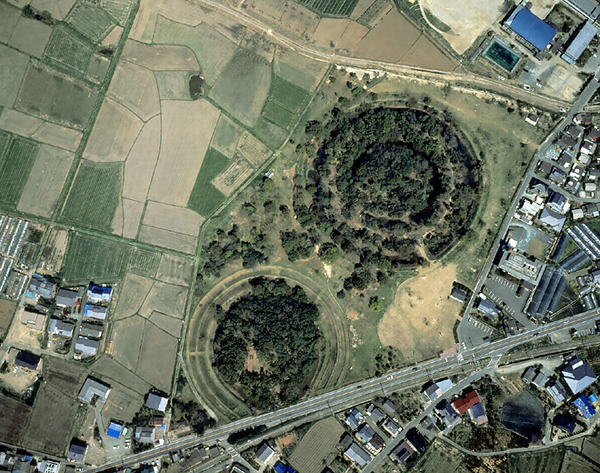 畧方形ノ造出アル圓形墳ニシテ高サ約三十四尺徑約三十一尺頂部ニ発掘セシ形迹アリ環湟ハモト三重ヨリ成リ今第二湟第三湟ハ多ク埋メラレテ僅ニ一部ヲ存セルニ過ギザレドモ尚舊規ノ見ルベキモノモアリ