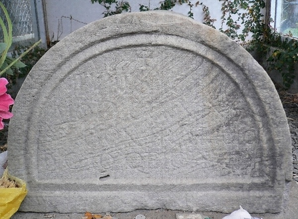 全長約1.21メートル、幅約0.56メートル、高さ約0.39メートルの蒲鉾形を呈し、材質は俗に天草石といわれる天草産の砂岩である。前面頂部に少さい等辺十字を刻し、その下にローマ字をもつて『FIRISACYE■MONDIOG”XONE■83GOX IRAI1610■IVG16 QEICHO15』と彫られている。後面及び前面に接する背部上にそれぞれ花十字が刻されている。
