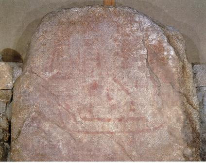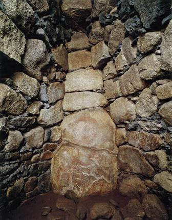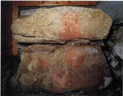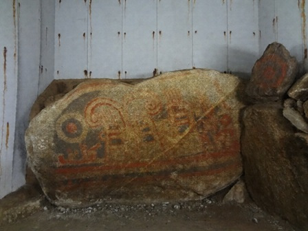 水縄山麓の台地端に存する古墳で、墳丘は殆ど失われ、横穴式石室の玄室奥壁及び向って右側壁の最下部の部分のみ遺存しているに過ぎないが、壁面に壮麗な絵馬が施されている。奥壁は幅約二・五〇米高さ約一米の花崗岩よりなり、表面に朱色及び藍青色を以て同心円、蕨手文、靱、舟、人物等が画かれ、殊に舳に鳥の静止する図や蟾蜍文等に見るべきものがある。これ等の画は黄褐色の石肌を巧みに生かして描線は朱色、地塗は藍青色を以て配され、その画題に■事詩的な風格を具え、わが国古代の芸術生活を知る上に貴重な資料である。