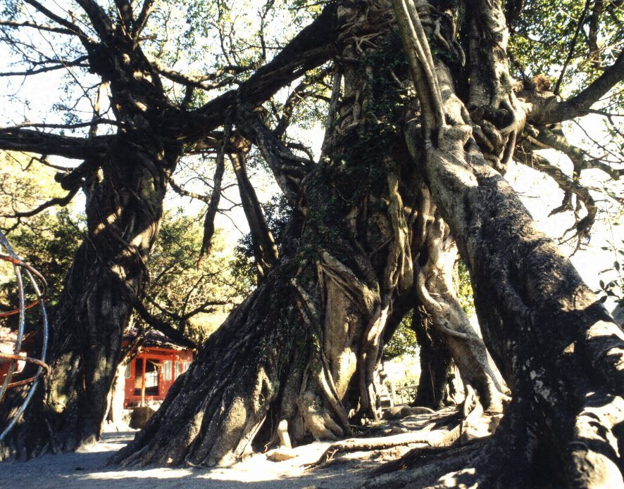 根元周圍一〇・五メートル、目通幹圍五・九メートル、樹高約一五メートルニシテ枝ノ展開一〇〇メートルニ及ビ氣根ハ多數地上ニ垂下ス あかうノ巨樹ノ一ナリ