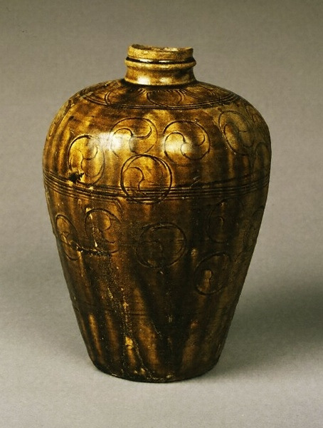 中国陶磁の白磁梅瓶を手本として12世紀末に瀬戸窯で創出した梅瓶形の瓶子に鉄釉を施したものである。堂々とした形姿に、印花により施された文様もくっきりと現れ、鉄釉もよく溶けて明るい黄褐色に発色し、典型的な釉調を示している。