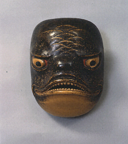 明治維新で絶えた狂言の一流派、鷺流で使われたと考えられている面であるが、演目などは不明。大きく左右に裂けた口、鋭い歯や目はいかにも動物のものだが、魚の正面顔がユーモラスである。