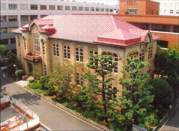 木造2階建,寄棟造,鋼板葺で,外壁は目地切のモルタル仕上げとする。南面西寄りに玄関をわずかに突出させ,角塔と駒形の破風で飾る。南東隅部も角塔に扱い,2階窓は3連アーチとする。当初は1階が図書室と書庫,2階が大講義室と会議室兼来賓室であった。