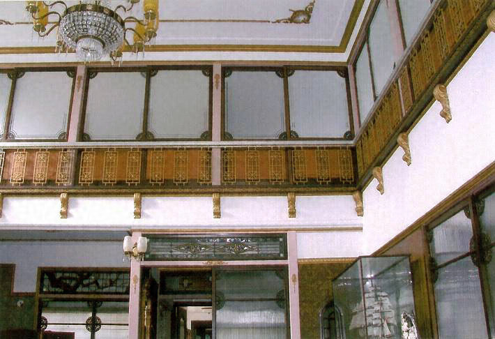 元織物工場の事務所兼住宅。南側は工場を改装した木造2階建,切妻造の洋館で,下見板張外壁に上げ下げ窓を開く。内部は吹き抜けで,畳敷のギャラリーを巡らす。洋館の北に接続する木造2階建の和館は洋風小屋組である。玄関は大オーダーの円柱と円窓で飾る。