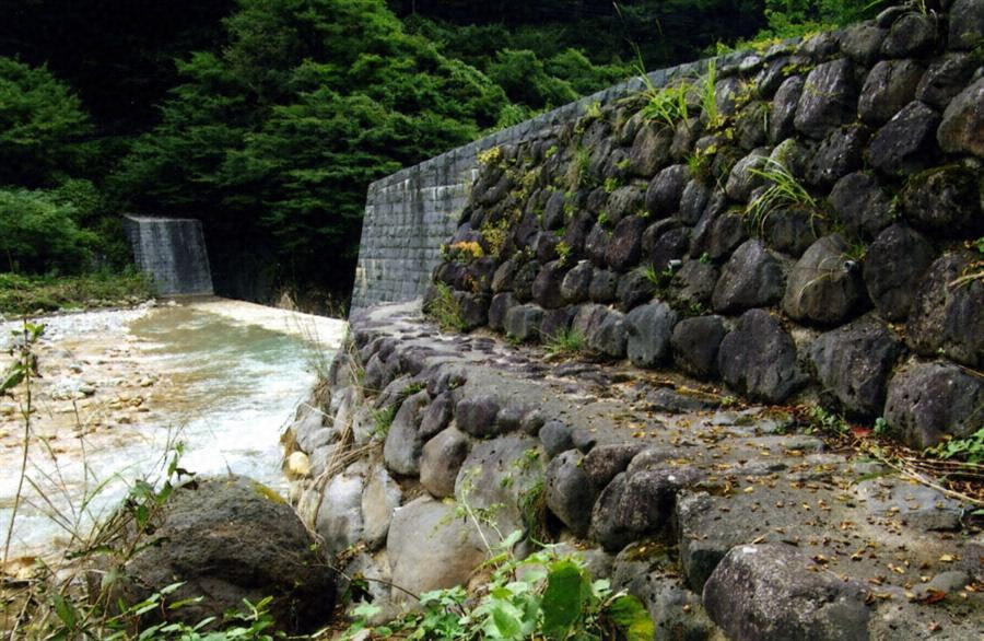荒川第六堰堤から約1,600m上流、土湯温泉の上手に位置する。堤長54m堤高13m、上流法勾配4分、下流法勾配2分とした重力式コンクリート造堰堤。表面石積。荒川の近代砂防堰堤の中で最大の天端幅をもつ強固なつくりで、温泉街を土砂災害から守る。