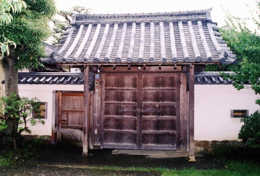 敷地南辺から北へ6m程度退いて東西棟で建つ。門口幅2.4m、切妻造本瓦葺、総欅造の薬医門で、妻は撥束上に大斗肘木、軒は一軒疎垂木とする。東側離れ北西端との間に長1.6m、西側に長2.2mの石積基礎、本瓦葺の袖塀が付き、東袖塀に潜りを設ける。