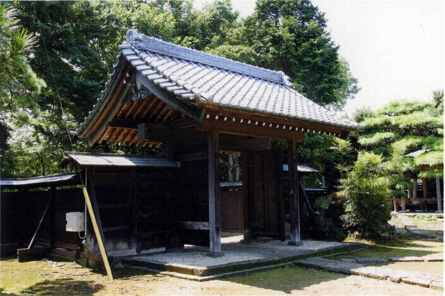 通りから石段を上がったところに西面して建つ。間口2.8mと大型の一間薬医門で、両脇に袖塀を付ける。切妻造桟瓦葺。本柱上に冠木、男梁を架け、一軒疎垂木。両開戸を構え、南袖塀に潜りを穿つ。簡明な構造で、部材が太く、力感にあふれる。