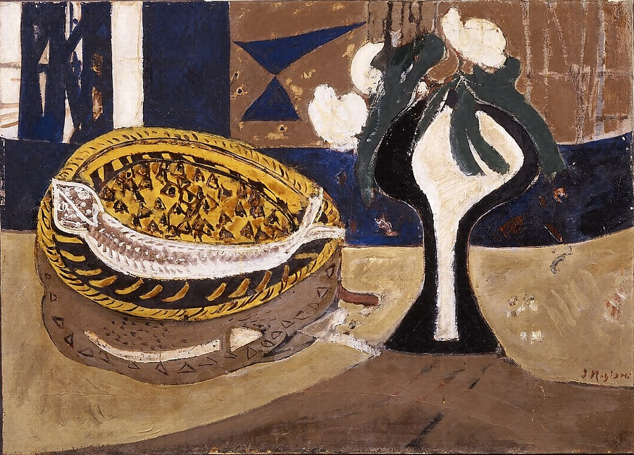 魚の骨や頭はまるで模様のように幾何学的に表され、ざるの網目も模様化されている。ざるは釉薬でもかけたかのように艶やかな色で、他の部分とは違うマチエールである。身近なものを用いて画面を組み立てていくのだが、それらは画家の創造力により当初の姿を変え、周囲の影や背景、机などと組み合わされ、画面を形成する構成要素のひとつとなる。しかし、魚のピンとした新鮮さや、白い花びらのやわらかさは残されている。この時期、本作品のように、花や魚をモチーフに造形性を重視した作品を多く描いている。