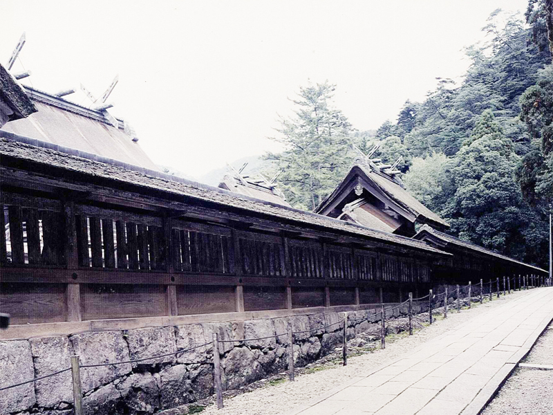 出雲大社は,島根県北東部に鎮座する古社である。境内は,国宝本殿を中心として三重に囲繞する垣によって区画され,本殿周囲には摂末社や宝庫が並び,南面中央東寄りに銅鳥居を配し,その南東には会所がある。