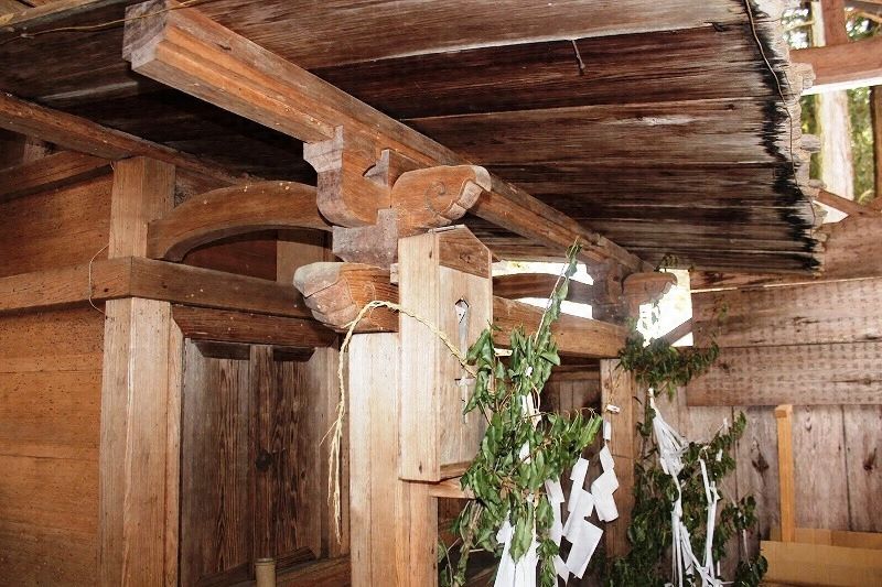 本殿と若宮八幡宮本殿は、境内後方の覆屋の中にならんで建ち、ともに流造、板葺で、元亀四年(一五七三)の建築である。全体に簡略な形式とする点に特色があり、保存状況は良好で、室町時代に建築年代が遡る二棟の社殿が並立してのこることに価値がある。