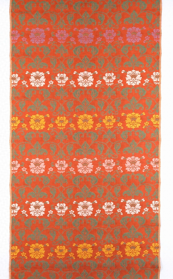 本作品は、東京国立博物館所蔵「鐙直垂(伝護良親王御直垂模造)」の「赤地蟹牡丹文錦」を参考にして、それを広幅(曲2尺、61㎝)で制作したものである。