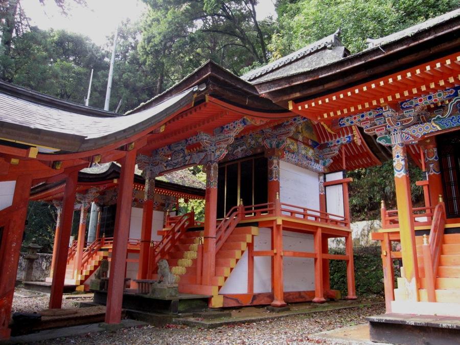 高倉神社は大谷山の裾野に鎮座する、記紀が記す東征に由来する逸話をもつ古社である。現在の各社殿はいずれも天正2年(1574)仁木長政が再建したもので、三社を別棟として中央殿(本殿)及び左殿(八幡社)を流造、右殿(春日社)を春日造とし、蟇股内の彫刻、手挟、頭貫の木鼻等に桃山時代の特色をよく残している。