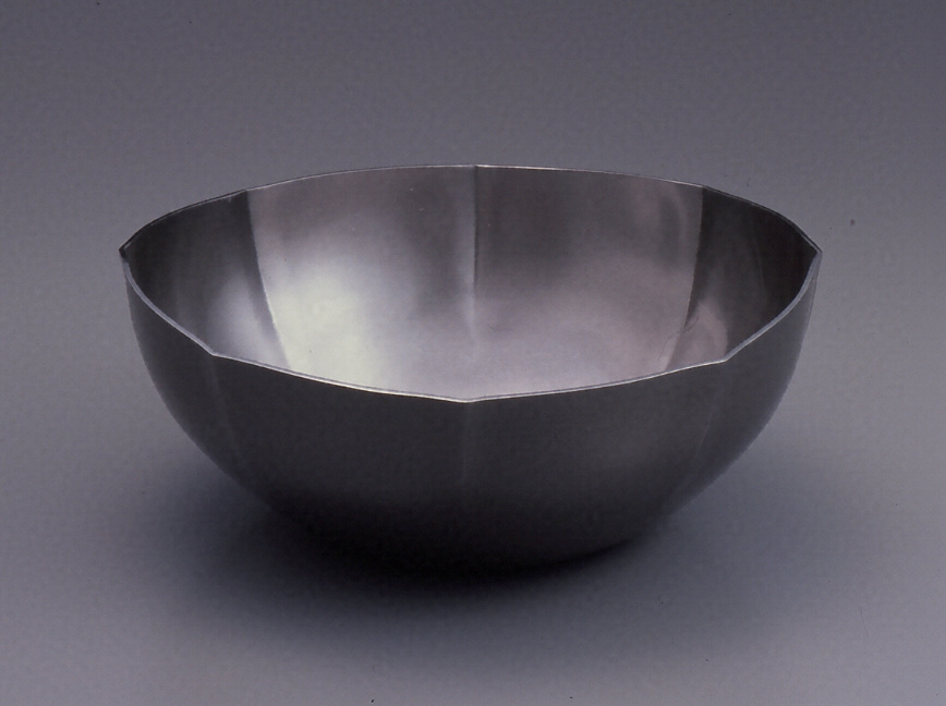 仕上げは外面と内面で異なり、外側は鎚目による梨地とし、内側は磨いて、表裏の質感に差を見せ、四分一の独特の風合いを生かした。