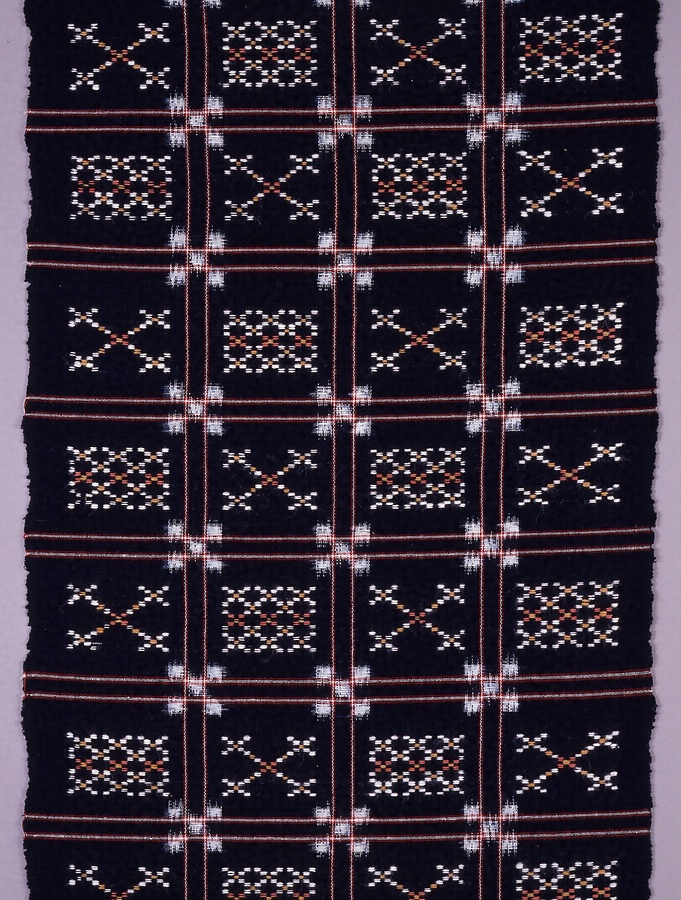 木綿紺地格子に経緯絣カジマヤー文様花織帯地