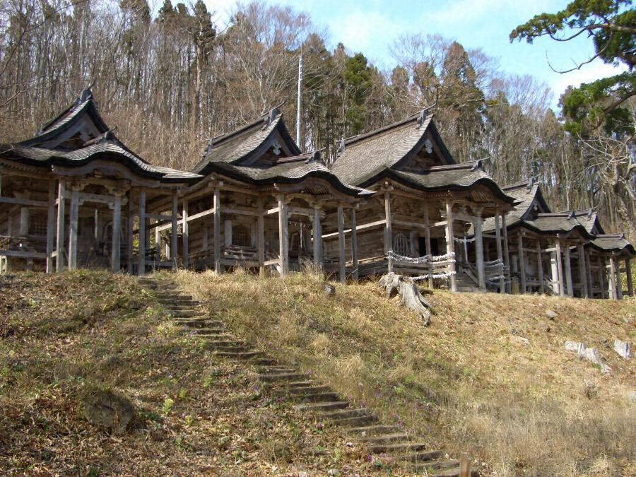 五社堂は、中央に正面入母屋造、妻入の赤神権現堂をおき、この両側にやや小規模の同形式の堂を二棟づつ並べている。各堂とも要所に彫刻を施して装飾する。