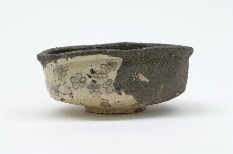 丸みをもつ腰部から胴部が直上し口縁部を外反させた沓形碗で、体部を強く押さえて楕円形に整えている。内面に浅い茶溜まりを設ける。底部には正円形の高台を削り山しているが、高台端部の幅が極めて広く、高台内の削りも浅い。高台周辺の底部をラフにヘラで調整している。胴部の一方に窓を残して鉄釉を施し、窓には梅花文を鉄で描いて長石釉を掛け分ける。焼成不足気味で、長石釉はよく熔けて透明感があるが、鉄釉の熔け具合は不十分で杣子肌となっている。