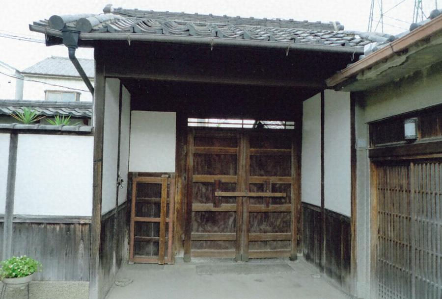 敷地東辺の中ほどに開く正門で、北に外塀が延び、南に離れを接続する。桁行3.1m梁間2.9m、木造平屋建、切妻造桟瓦葺で、門口2.1mとして欅一枚板の板戸を両開に吊り、北側の小脇壁に潜り戸を設ける。壁は漆喰塗と竪板張で、外塀と外観を整える。