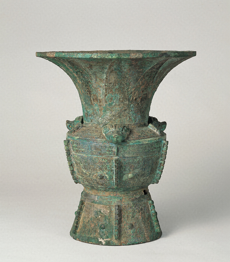 尊とは口縁が大きく反って開き、高い脚部を持つ器物で酒を入れる容器であった。この尊は肩が強く張り、胴との境が鋭く折れ曲がるため有肩尊と分類される姿をしている。肩に三つの犠首を飾り、胴と脚部には鋭い稜飾りを付け、文様の彫りも鋭く精緻な作行きを見せている。大きく開いた口勁部には蕉葉夔文を置き、その下部に象鼻の夔文を横長に配している。肩部には冠毛のある夔文を下向きに置き、胴と脚部には大きな目を持つ饕餮文があらわされているが、それぞれ異なった姿を見せている。