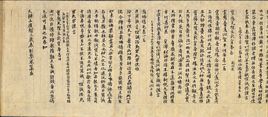 『不空三蔵表制集』六巻は、唐長安の大興善寺の沙門不空三蔵(705〜774)に関する公文書を、西明寺の沙門円照が、不空三蔵の歿後、貞元年間(785〜805)の初めころに編纂した重要資料で、我が国には弘法大師空海によって請来されたと考えられている。中国ではすでに散逸したものの、本邦には青蓮院本はじめ、高山寺新旧二本など、数種の古写本が伝存し、その最古の写本と見られるものが石山寺本である。現在、卷第一が東京国立博物館に、卷第二・第四の二巻が個人、卷第三が石山寺、卷第六が五島美術館に、それぞれ所蔵されていて、いずれも重要文化財に指定されている。「石山寺」印を捺すことから、もと石山寺にあったものが巷間に出たとみられ、本館に近時収蔵の卷第五は、明らかにこれと一具をなすもので、本館本を含めて最古の写本の全巻が揃ったことになり、貴重である。