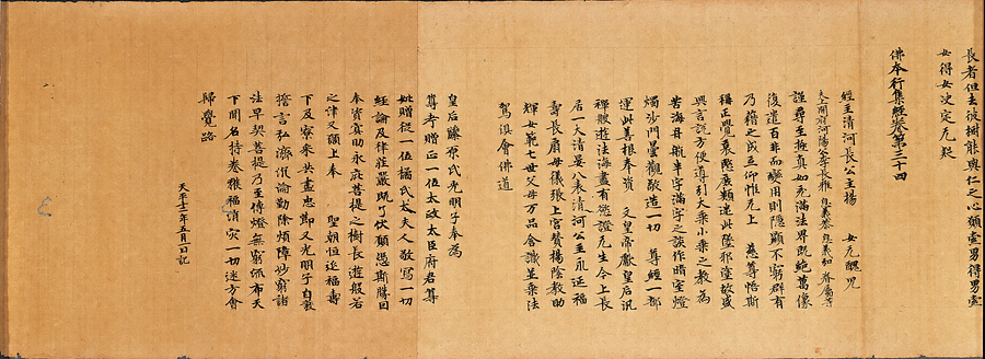 天平12年(740)5月1日、光明皇后(701〜760)が父藤原不比等と亡母県犬養三千代の追福のために敬写した一切経の一部をなすもので、奥書願文の日付から「五月一日経」と通称される。正倉院文書によれば、この写経事業は願文の日付を遡る天平8年、皇宮宮職の写経所で始まったものの、奥書にある天平勝宝元年(749)頃まで、15年前後にわたって行われたらしく、つごう7000巻余りの経巻が書写された。現在正倉院聖語蔵に750巻、巷間に約250巻が伝存し、本館にも本経を含め『増一阿含経』巻第十二(図108)、『瑜伽師地論』巻第二十四、『十誦律』巻第五十六、『仏説中陰経』巻下など8巻が蔵される。