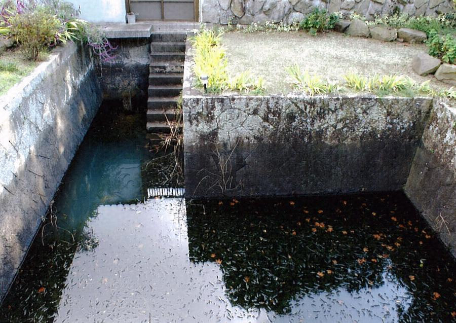 離れ南側に築かれた池の石積で、矩形の池の西面と南面を張り出してL字形をなし、東西五・九メートル南北九・八メートル、深さ二・七メートルを測る。砂岩切石を、弛みをもたせて巧緻に積み、一部に瓢箪と杯をかたどった積石も用いて風情をもたせる。