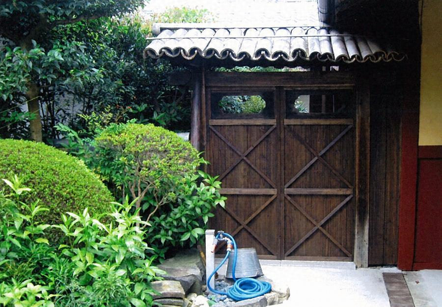 主屋と土蔵との間に露地門と仕切り塀が東西に続き、庭を間仕切る。仕切り塀は延長三・〇メートルの練塀で、東端、主屋式台脇に接して露地門が建つ。間口一・四メートルの腕木門。屋根は切妻造、孟宗竹を半割にして輪違いに並べて葺く、珍しい仕様になる。