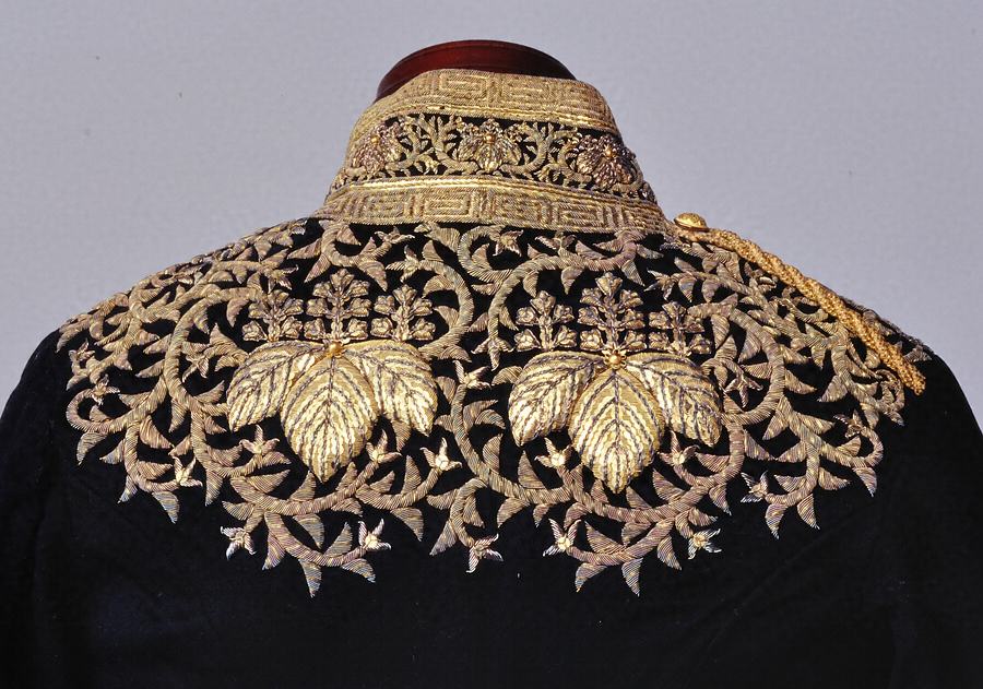 明治13年(1880)3月8日付で特命全権公使イタリア在勤を命じられた11代鍋島直大が持参した大礼服。帽子・上着・ベスト・ズボン・肩章・剣釣からなる燕尾服で、黒羅紗地に五七の桐紋と蔓模様が金刺繍であらわされる。大礼服は明治5年に制定されて以来度々改定され、同17年10月には飾章まで細かく制定された。文官の大礼服は19年に確定するが、この大礼服はそれ以前の原型といえ、大変貴重なものである。この大礼服を着用した「鍋島直大像」(百武兼行筆)はローマで描かれ、帰国の年の明治15年2月11日に完成した。
