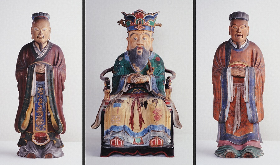 佐賀城の南西に位置する鬼丸聖堂に安置されていた孔子倚座像・顔子立像・不詳立像の三体。孔子像は銅製の倚座像で全体に極彩色が施され、弟子2躯は木造で厚く胡粉をぬり彩色を施す。従来、3像の制作年は『綱茂公御年譜』の記述より鬼丸聖堂が城内から移建された元禄年間とされていたが、胎内蔵の紙片銘により、弟子2躯は宝暦12年(1762)の作ということが判明した。鬼丸聖堂は弘化3年(1846)に取り壊され、この3体と天縦殿扁額は藩校弘道館に安置された。江戸時代における佐賀藩の学問の精神を今に伝える資料である。