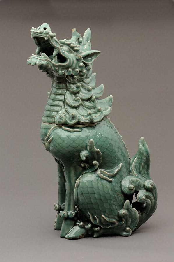 大川内山に設けられた佐賀藩主鍋島家の御用窯である鍋島藩窯で焼かれた青磁の優品。胸部を境に上下二つの部位からなり、鱗や毛並、眼光の強さなど、空想上の動物とは思えない迫真性をもつ。もと佐賀城内にあり、明治7年(1874)におきた佐賀の乱の際に頭上の角の先端を破損したという。1876年の米国独立博覧会(フィラデルフィア万博)に大川内の市川光之助が白磁一対を出品した際に、本品を手本(見本)とした。