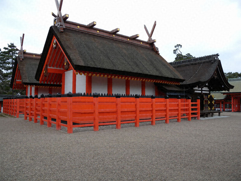 住吉大社本殿は四棟すべて海に向かって西面し、西から第三殿、第二殿、第一殿の順に縦に並び、第三殿の南に第四殿が建つ。住吉大社本殿の式年遷宮は17世紀始めに再興され、今の本殿は文化7年(1810)の造替時のものである。