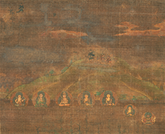 社殿の上方には七体の本地仏が虚空中に現れる。向かって左から文殊菩薩、地蔵菩薩、十一面観音、釈迦如来、阿弥陀如来、薬師如来、毘沙門天であり、それらは葛城高額比売命(かつらぎのたかぬかひめのみこと)(神功皇后の母)、気長宿禰王命(おきながすくねおうのみこと)(神功皇后の父)、息長足比売命(おきながたらしひめのみこと)(神功皇后、応神の母)、足仲津比古命(たらしなかつひこのみこと)(仲哀天皇、応神の父)、誉田分命(ほんだわけみこと)(応神天皇=八幡神)、伊古麻都比古神(いこまつひこがみ)、伊古麻都比売神(いこまつひめがみ)にあたる。すなわち応神天皇を中心とする八幡三神と、応神の母である神功の父母の各神格を中心に、本来の生駒神を脇に配している。上方には随身とともに生駒山に降臨する八幡神が描かれる。こうした図様は、鎌倉時代後期の元寇を契機として弓箭の神である八幡神が中世生駒神社に勧請され祭神となったことに関係している。表現は細緻であり、鎌倉時代の本格的な垂迹画として重要である。