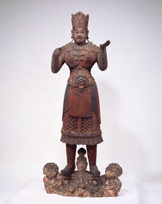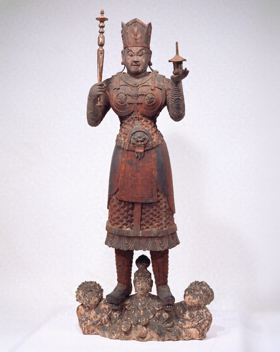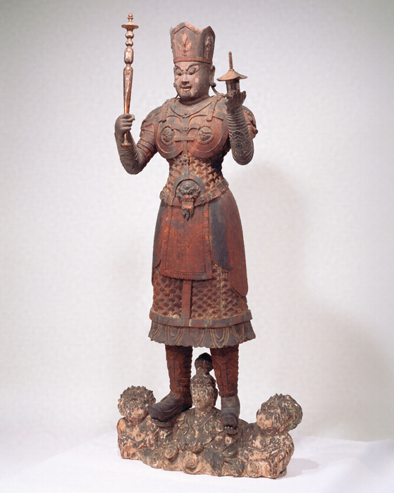 京都・東寺には中国・唐から将来され、平安京の守護神として羅城門(らじょうもん)上に安置されたと伝える毘沙門天(びしゃもんてん)が現存する。「兜跋毘沙門(とばつびしゃもん)」と称されるこの東寺像は、宝冠をかぶって外套状を呈する金鎖甲(きんさこう)(鎖を編んだ鎧)をまとい、二鬼(尼藍婆(にらんば)・毘藍婆(びらんば))を従えた地天女(ちてんにょ)が差し出す両手の上に立つなどの特徴がある。本像はその忠実な模像で、原像の精悍な顔立ちや引き締まった体つきもよく再現されている。なお「兜跋」の語源・語義については諸説あるが、近年は毘沙門天がもつ宝塔(ストゥーパ)に由来するとの見方が強い。