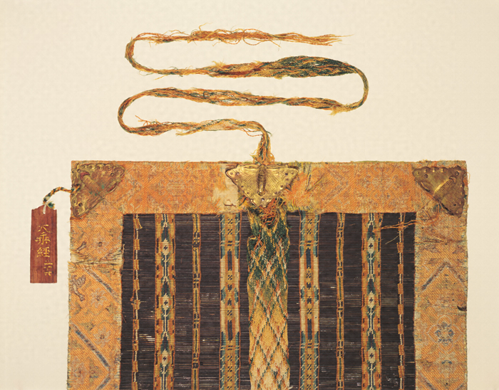 神護寺経は後白河法皇が鳥羽法皇勅願の意志を継いで文治元年(1185)に完成させた紺紙金字一切経で、本品は神護寺経を約10巻ずつ巻いていた経帙である。墨染めの竹ひごを段々(だんだら)文様に染めた10本あまりの色糸ですのこ編みし、紅地唐花襷文の錦で周囲を縁どりしている。芯には紙を入れ、竹のすのことの間に一面に雲母(きら)を敷きつめている。紐は平組で襷文。帙の二隅と紐に蝶形の金銅打出金具が留められている。制作の事情が明らかであり、平安後期の贅を凝らした経帙の作例として誠に貴重である。現在、神護寺には経典2317巻、経帙202枚、経櫃45合が伝存しており、重要文化財に指定されている。